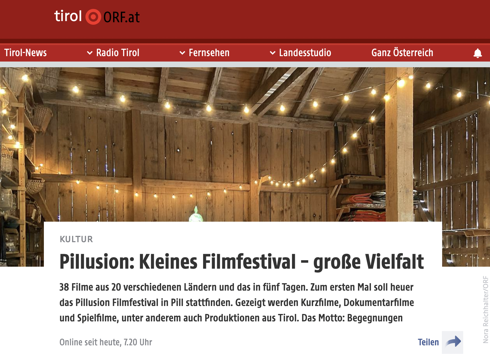 Pillusion on Tirol.ORF.AT Posted byMarina Decristoforo6. September 2022Posted inAllgemein Today an article on our Film Festival was published: https://tirol.orf.at/stories/3172169/ Share this: Click to share on X (Opens in new window) X Click to share on Facebook (Opens in new window) Facebook Like Loading... Related
