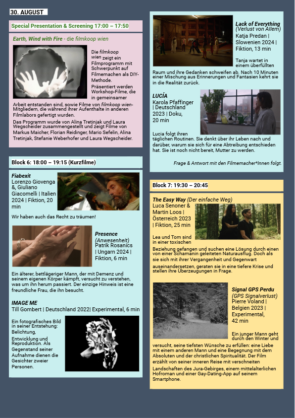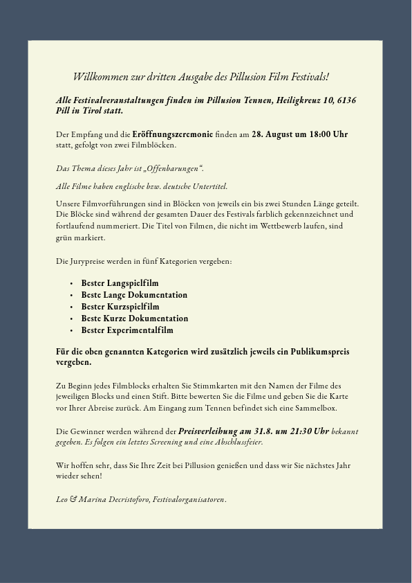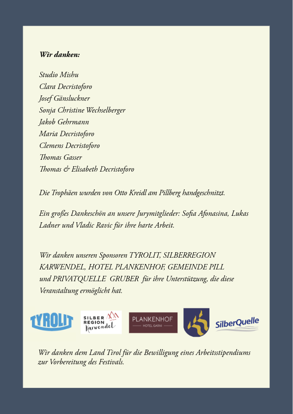 Die Festivalausgabe 2024 ist vorbei und wir können nicht genug betonen, wie dankbar wir allen sind, die das ermöglicht haben! Es war eine wirklich besondere Zeit und wir haben uns sehr gefreut, 20 unglaubliche Filmemacher aus der ganzen Welt hier in Pill zu treffen und zu beherbergen (16 davon hatten auch ihre Unterkunft am Festivalort)! Vielen Dank an alle, die ihre Werke präsentiert haben, alle die zu den Vorführungen gekommen sind und natürlich an unsere Jury und unsere Mitarbeiter, die hart gearbeitet haben, diese vier Tagen besonders zu machen. Wir freuen uns, dass unser Festival so gut besucht war und freuen uns auf weitere ausverkaufte Abende im nächsten Jahr! Und natürlich gratulieren wir all unseren wunderbaren Gewinnern!