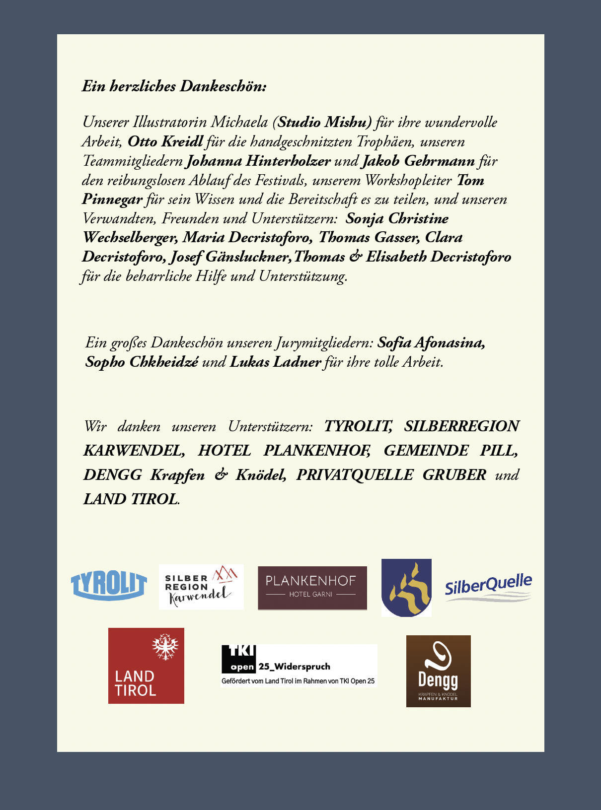 Die Festivalausgabe 2025 ist vorbei und wir können nicht genug betonen, wie dankbar wir allen sind, die das ermöglicht haben! Vielen Dank an alle, die ihre Werke präsentiert haben, alle die zu den Vorführungen gekommen sind und natürlich an unsere Jury und unsere Mitarbeiter, die hart gearbeitet haben, diese vier Tagen besonders zu machen. Wir freuen uns, dass unser Festival so gut besucht war und freuen uns auf weitere ausverkaufte Abende im nächsten Jahr! Und natürlich gratulieren wir all unseren wunderbaren Gewinnern!